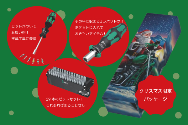 サンタがバイクに乗っている、いかしたパッケージが特長のWERA限定セットが今年もやってきました!個人的には、ビットセットと、ビットドライバーのまとめ買いも良いなと思ったり…