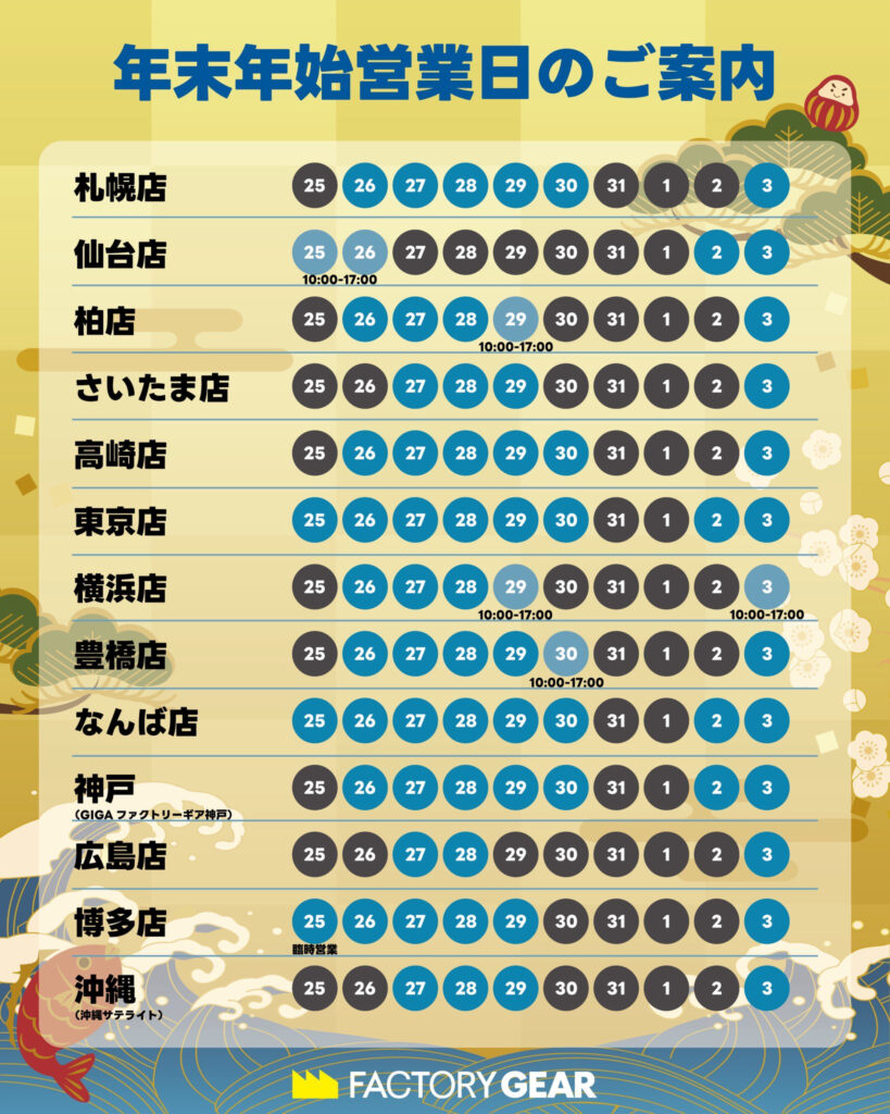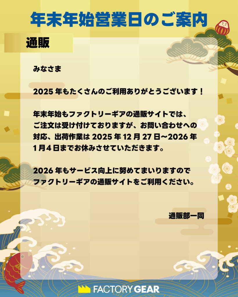 2025年も大変お世話になりました。来年もあなた様のお仕事や、趣味、日常の中にファクトリーギアが少しでもお役に立てるように、日々精進してまいります。