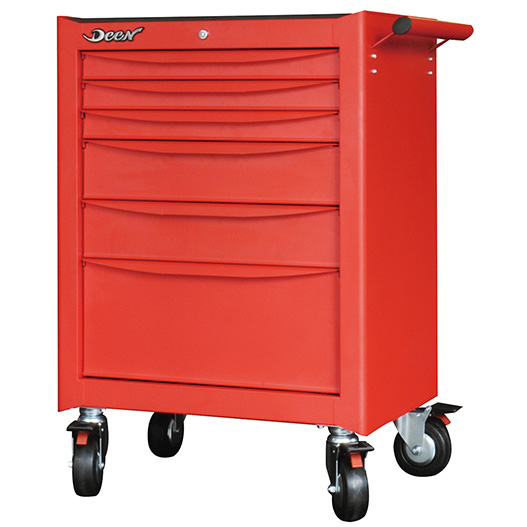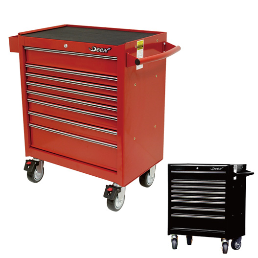多くのキャビネットは、長い工具は外付けにしたり、斜めに入れて他の工具を収納できるスペースを奪っていませんか?DEENの8段キャビネットは、600mmのスピンナーハンドルやトルクレンチが真横に収納することができます。また、2~5段目の引き出しは高さがあまりないのですが、スパナやメガネをきれいに収納するために薄くしています。その為、それぞれの工具が重なる事が無く綺麗に収納でき、一目で何がどこに保管しているかが分かるようになっています。