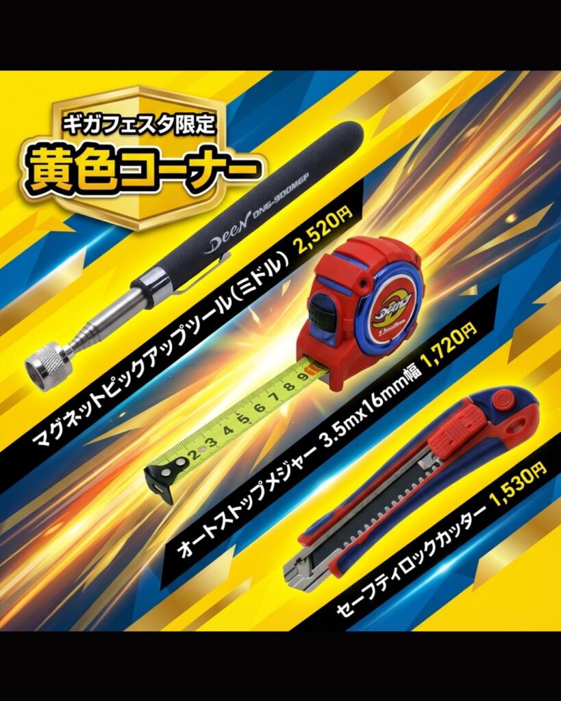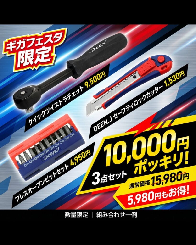 そんな「ポッキリ企画」で選べるアイテムの一部を公開!複数の工具を赤・青て黄コーナーからそれぞれひとつ選び“ポッキリセット”にして、【税込1万円】で販売します!