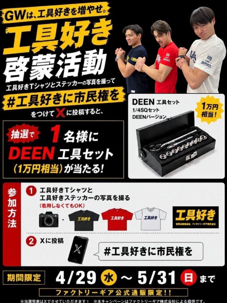 さらに!工具好きステッカーと工具好きTシャツを撮影頂き、Xへ#工具好きに市民権を をつけて投稿頂くと、1名様に抽選で1万円分相当のDEEN1/4sq工具セットをプレゼント!