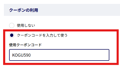 2.「クーポンの利用」へクーポンコード「KOGU590」を入力ください。