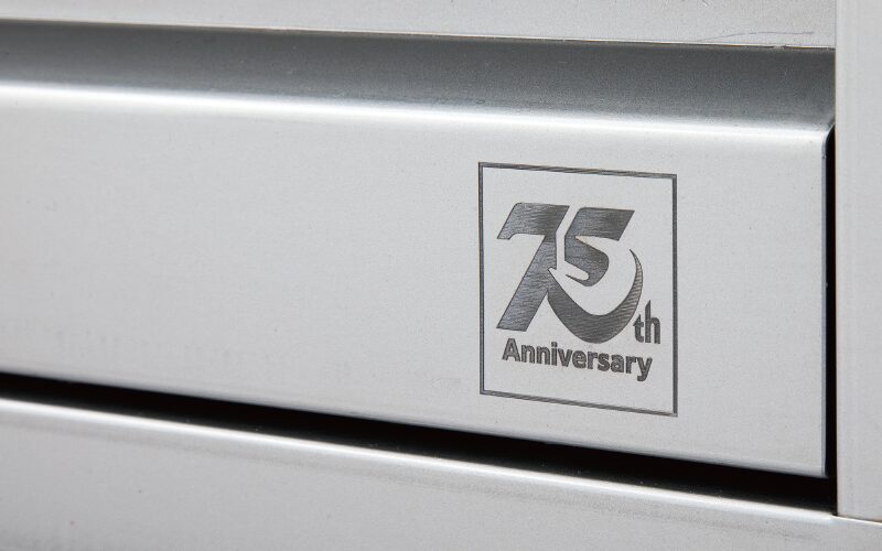引き出し正面に75周年記念ロゴをレーザーで刻印いたしました。